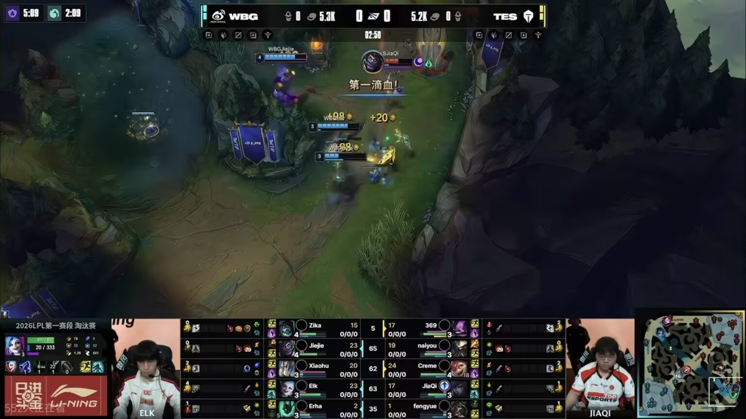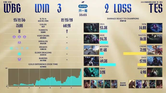 In the decisive game, WBG placed all their bets on ELK, employing a four-protect-one composition around Jinx with their top, jungle, mid, and support. When they locked in this draft, viewers were quite anxious for Weibo. While the current meta focuses on the bot lane, if the ADC falls behind early, the game is basically over. WBG's four-tank frontline composition lacks significant damage until Jinx scales, forcing them to stall.